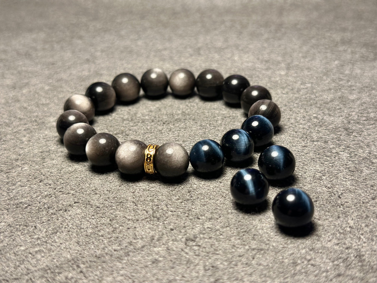 它巧妙地將銀黑曜石的光滑金屬光澤與虎眼石的溫暖金棕色光芒結合在一起,創造出力量與和諧的驚人平衡。銀黑曜石以其神秘的光澤而聞名,象徵保護和內在的力量,而光芒四射的虎眼石則以其獨特的反光特性,代表著勇氣和自信。中心的金色點綴增添了奢華感,使這款手鍊成為日常佩戴和特殊場合的完美配件。